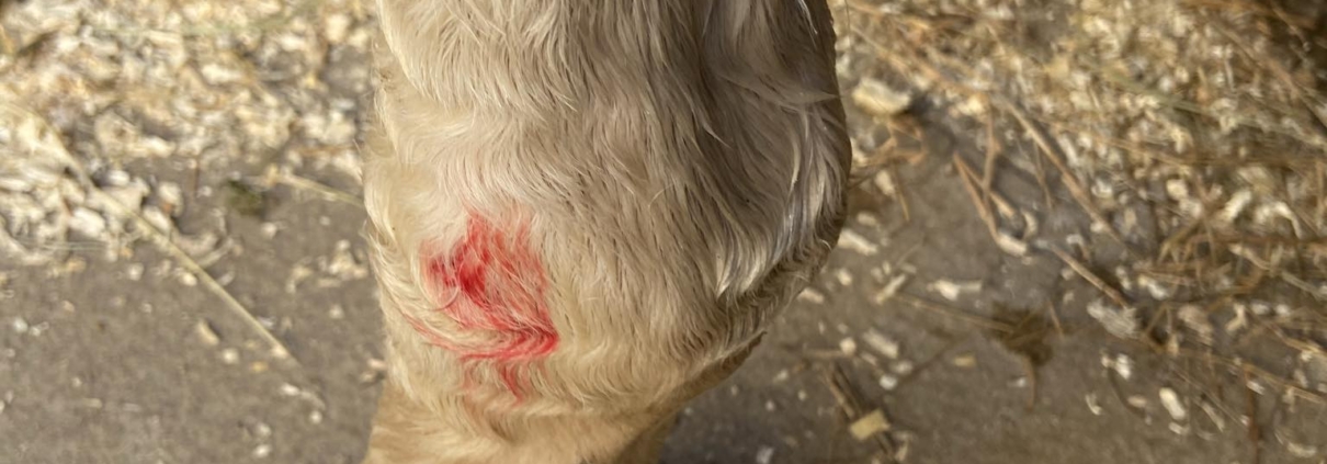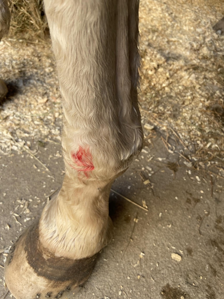 Vi kommer hjem med en hest, der har et tydeligt mærke/sår efter at være ramt af en konkurrent.